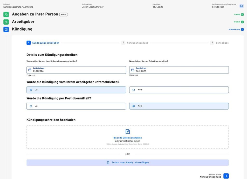 Justin Legal ist der digitale Anamnesebogen für Kanzleien – maßgeschneidert auf die jeweilige Anfrage