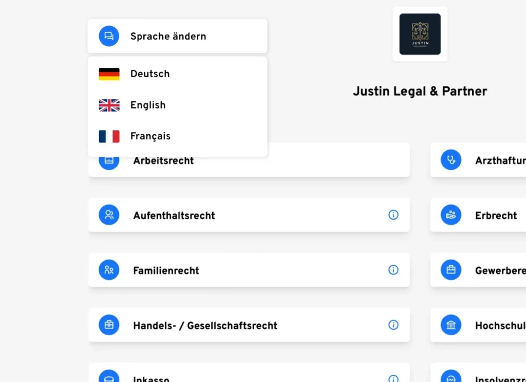 Wer direkt alle Infos und Dokumente haben, hat endlich Zeit für die Rechtsberatung selbst. Genau das übernimmt Justin Legal durch Anfrage-spezifische Formulare und den immer-verfügbaren Chatbot für Sie.