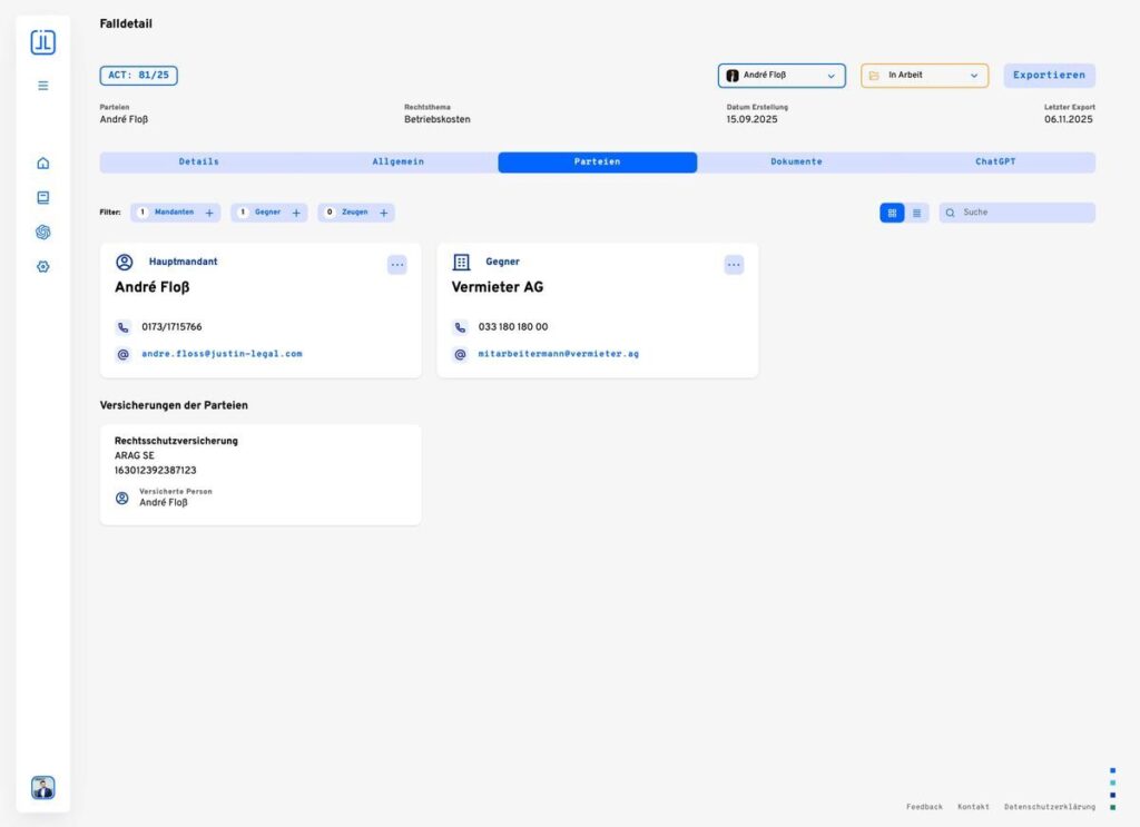 Unkonkrete Anfragen gehören der Vergangenheit an: Justin Legal lässt den Mandanten selbst alle notwendigen Infos vorfüllen, bereitet die entsprechende Akte vor – und hilft Ihnen dank KI sogar bei der Bearbeitung.
