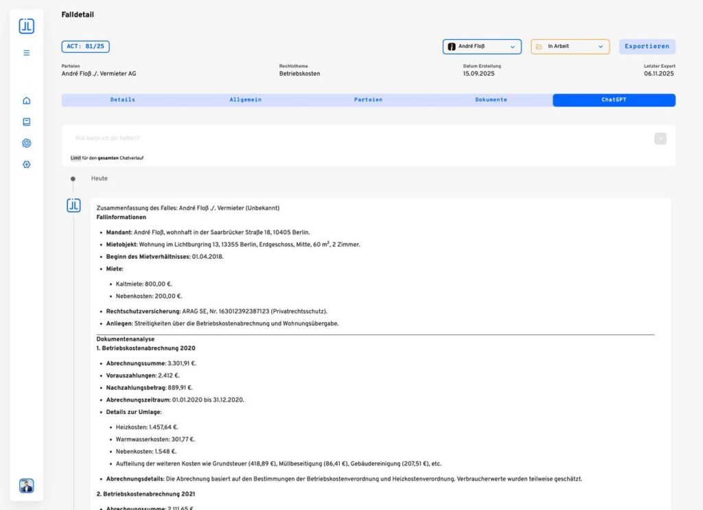 Die Kanzlei der Zukunft ist hier: Sie stellen eine Frage. Die Anwalts-KI recherchiert, analysiert und antwortet mit allen Infos der Akte.