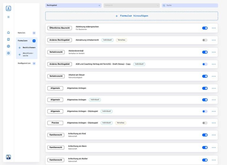 Justin Legal führt Interessenten und Mandanten für Sie bis zur fertigen Akte: Schrittweise Abfrage aller jeweils notwendigen Informationen und Dokumente, genau auf die jeweilige Anfrage zugeschnitten. Fertige Formulare für die 116+ häufigsten Fällen aus 20 Rechtsgebieten. 1-Klick-aktivierbar.