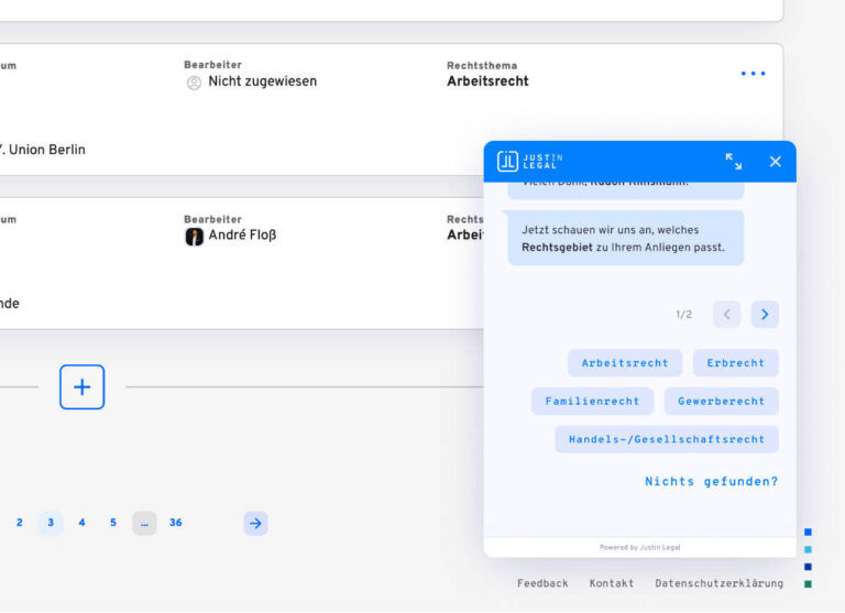 Durch geführte Dialoge alle Infos und Dokumente sofort bei der Erstanfrage bekommen. Und das immer passend auf die jeweilige Anfrage: Mit Justin Legal starten Sie nicht erst mit Rückrufen und Anhängen – sondern direkt mit der Beratung.