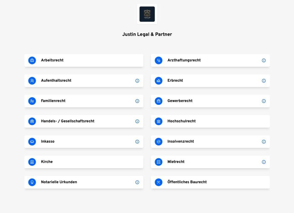Justin Legal fragt von zukünftigen Mandanten direkt alle für die jeweilige Anfrage notwendigen Infos und Dokumente ab – vorgefertigt für die 116 häufigsten Anfragen aus 20 Fachbereichen. Komplett personalisierbar. Oder Sie legen eigene Abläufe für Ihre Kanzlei an.